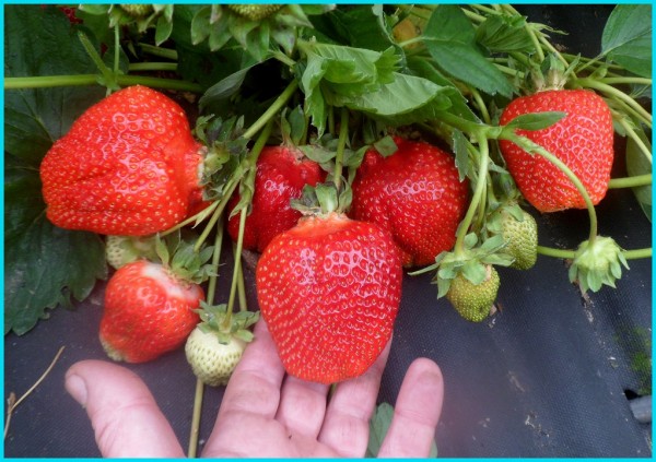 Ягоды: Очень крупные (30–40 г, первые до 70–80 г), конической удлиненной формы, ярко-красные с глянцевым блеском. Мякоть плотная, хрустящая, красная, без пустот.